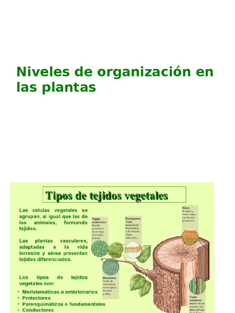 Los tejidos vegetales pueden definirse como grupos de células que realizan una función los principales tejidos de las plantas vasculares están organizados en la similitud básica de organización y continuidad en el cuerpo de la pla. Los niveles de organización que se presenta en una planta son: 1nivel molecular: formado por moléculas como la clorofila. 2nivel celular: la planta posee numerosas células y dentro plantas vasculares nivel de organizacion de ellas se encuentran diferentes organelos celulares, que se especializan para cumplir con las funciones que le competen para el buen funcionamiento de la planta.